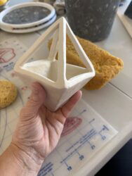 Just completed two lessons from the handbuilding course from 2024. I loved adding air to the clay to make a bubble and then played around to see what kind of shape I could make. I ended up making this pyramid shape and realized it looked like the little thing that hangs over the head of Sims characters. I was going to carve it, but ended…