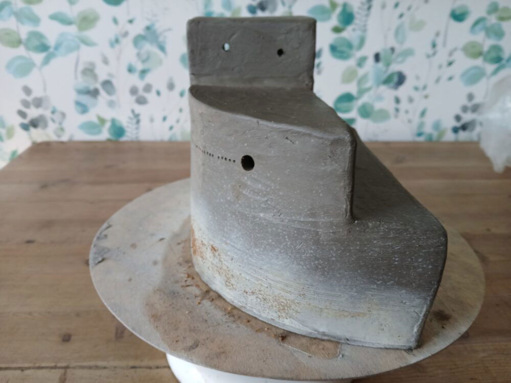 So have started by making a minimalist abstract closed vessel (non functional) that might be seen variously as a boat/ship, a container containing something(s) or perhaps a tomb or maybe a mausoleum. On one ledge is an item that is boc like but with what could be construed as eyes and a nose (as straight lines) and so could represent some form of mechanical being perhaps.